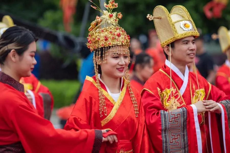 一曲优雅的舞霓裳拉开了婚礼的帷幕,让大家仿佛穿越到了古代,伴随着悠扬的音乐声,70对夫妇在礼仪的带领下,身着汉式喜服,长身玉立,面若桃花,款款入场。却扇礼毕,新娘一展朱颜;携手沃盥,作揖同礼,以敬天地;夫妻礼拜天地,互赠信物;行合卺礼,寓意同甘共苦;最后婚书落印,夫妻执手宣誓。在司仪的引导和众人的见证和祝福下,一系列汉唐传统婚礼仪式重现,一场喜庆祥和的婚礼圆满落幕。